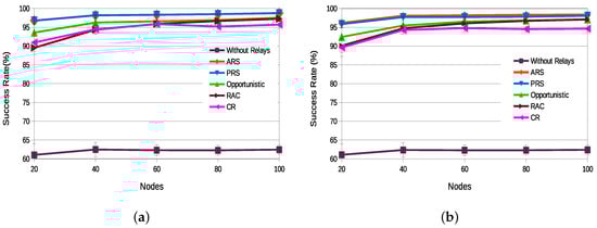 Figure 10a,b illustrate the success rate of all assessed relay selection techniques for static and dynamic network topologies, respectively. Both figures clearly highlight the importance of the relay retransmission techniques, as when retransmission techniques are not used (“Without Relays”), the obtained success rate is smaller than 65%. It is worth noting that, despite the good performance of state-of-the-art techniques, the proposed selection schemes ARS and PRS present better performance, with success rate above 95%, independently of the number of nodes and topology. For the static topology, ARS and PRS have basically the same probability of successful transmissions. For the dynamic topology network, where nodes may join/leave the network, the ARS updating scheme has a slightly better performance than the PRS. Among the state-of-the-art techniques, the Opportunistic scheme presented the best success rate results, and the Completely Random (CR) scheme presented the worst results.