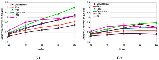 Figure 11a,b present the energy consumption in the network with static and dynamic topology scenarios, respectively. For both scenarios, the ARS technique presents the lower energy consumption, followed by the PRS and RAC techniques in the static topology scenario and the PRS technique in the dynamic topology scenario. The ARS technique presents an energy consumption lower than PRS because nodes do not need to listen and update the list of neighbors so frequently, it only being necessary to update the list of neighbors whenever a new relay selection is really necessary.