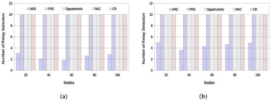 As the previous results have already shown the advantage of using cooperative diversity techniques, the next results discuss only metrics related to cooperation techniques. Figure 12a,b present the average number of relay selection operations in the network with static topology and dynamic topologies, respectively. It is possible to verify that the average number of relay selections made by the ARS technique in the static scenario is much smaller than in the dynamic scenario. This is due to the fact that the success rate of the network is just slightly changing during the simulation time for the static topology. On the other hand, for the dynamic topology scenario, the network suffers a significant number of modifications, imposing a higher rate for the relay selections.