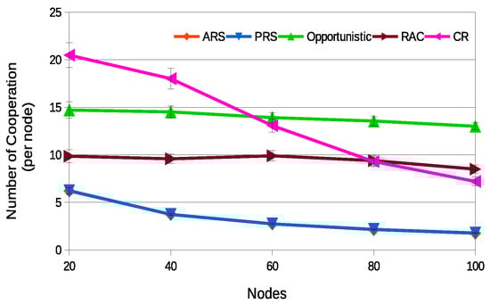 The CR technique is the one that presents the highest average number of cooperations per node in scenarios with fewer nodes (less than 60) because the probability that the same nodes will be selected as a relay is greater.