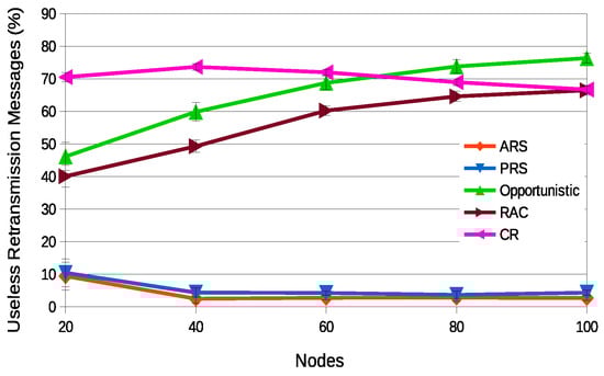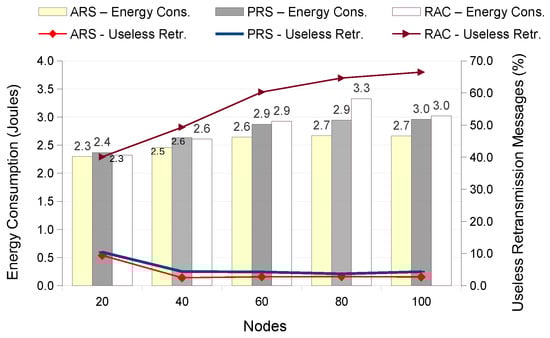 Finally, Figure 15 illustrates a correlation between energy consumption and useless retransmission messages of the two schemes proposed in this work (ARS and PRS) and RAC, which was the-state-of-the-art technique that obtained the best performance. It is possible to observe that ARS is the technique that presents the lowest energy consumption, being one of the main reasons the transmission of the smallest number of useless messages.