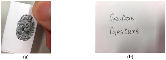 In recent authentication research, biometric authentication has increasingly become a research hotspot. Biometric authentication can be divided into static physiological characteristics and dynamic behavioral characteristics. Static physiological characteristics refer to the technology of personal identification by using the physical characteristics that are inherent in the human body. Using static physiological characteristics, some applications such as Apple face ID have been widely used []. Although static physiological characteristics have made some progress, their weakness of being easily imitated still exists []. Fingerprint copying and imitating handwriting are examples of cheating, shown in Figure 1.