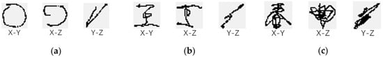 The images resulting from data normalization and 3D mapping. (a–c) Are the mappings of X-Y, X-Z, and Y-Z planes respectively. Because the “circle” gesture is 3D, the images in the X-Z and Y-Z planes may not look like circles.