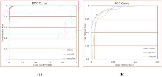 In this section, we will demonstrate the performance for the different complexities of gesture: Simple, normal, and complicated. We used the original data from six users’ gestures, and by manually adjusting the threshold value, we generated ROC curves, as shown in Figure 18.