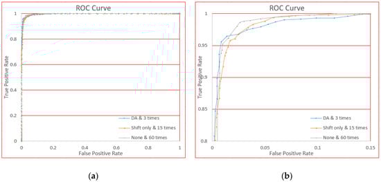 The ROC curve of using or not using data augmentation. (a) Is the global view and (b) is the local view for clarity.