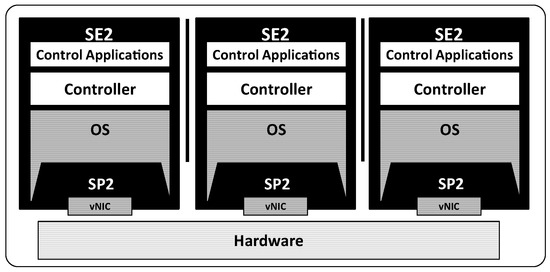 - Lack of isolation: Recent studies [11,12,13,14,15] report that rapidly developed prototype control applications can go awry. Furthermore, third-party control applications can contain unexpected vulnerabilities, fatal instabilities or even malicious logic. These malfunctioning control planes can affect other tasks running on the same physical machine. In particular, when different virtual networks are simultaneously constructed [16,17], the faulty control planes can cause the crash of the entire system, which leads to the loss of network control. This is because existing OSs run control planes as user-level processes and do not provide additional access control or an isolated execution environment. Therefore, it becomes necessary to provide strong isolation in the execution environment of control planes.