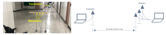 To verify the effectiveness of the diversity reception techniques for RFT detection, 4 XBEE S2C Modules working in 2.4 GHz are adopted, among which one is set as the transmitter, and the receiver consists of three modules. We performed the experiment at an indoor corridor at a general office building of our university under multipath environments, and the experiment sketch is shown as Figure 1. As shown in Figure 1, three receiver antennas are spatially separated, and we set the interval as the radio carrier wavelength, 0.125 m, to meet the requirement of space diversity reception.