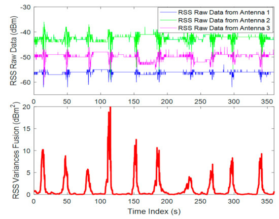 in which is the RSS mean value in the sliding window, and its unit is , which is calculated by . The Equation (2) means that we assign more confidence on the fluctuation that occurred on the antenna with higher RSS level. When the distance between transceivers is 10 m and , a pedestrian traverses the LOSL 10 times at normal speed (0.7 m/s), and the diversity RSS fusion data is presented in Figure 2. As shown in the figure, single receive antenna can detect 10 times of traverses, and detection can be even enhanced with the diversity RSS fusion.