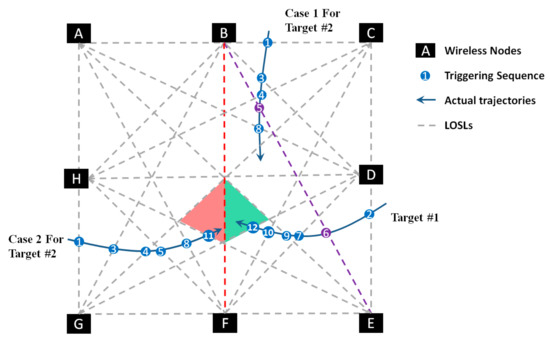 As discussed above, when the targets are located in separate areas in the monitoring area and they trigger the same LOSL, it is possible to calculate the trajectories by considering the later LOSL triggering sequence and eliminating the impossible possibilities. Moreover, we deduct the trajectory by step-wise calculation and get the final result which that fits in and explains all other criteria. However, when the targets are in close proximity to each other, it is sometimes impossible to find the exact trajectories.
