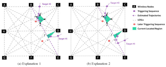 From the prior topology knowledge shown in Figure 5a, we can calculate that if was triggered only by Target #2 as and , then the target will be located in . Since the is , it must be triggered by Target #1, and thus Target #2 is located at . Afterwards, is triggered as and is triggered as . It is impossible to get the next trigger in or considering the current location of the two targets, because neither or are sides of and . Hence, Explanation 1 is eliminated. In the same way, Explanation 2 in Figure 5b can be also eliminated using the measurements of later triggering sequences and .