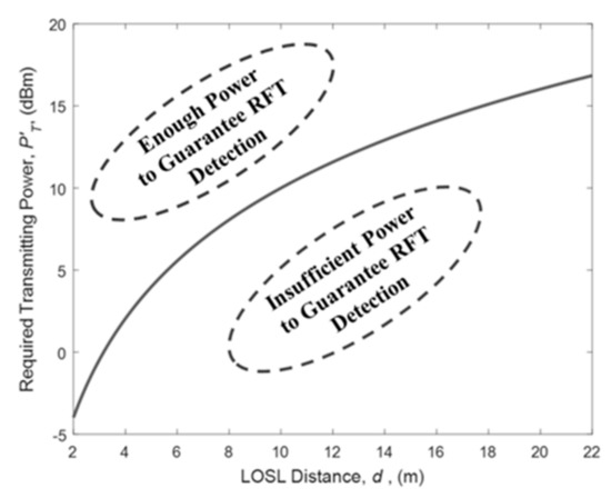 In a WSN operating at 2.4 GHz, and can be empirically set as and , respectively. Under this light, Figure 6 shows the condition of the minimum transmitting power with this model. As shown in the figure, the transmitting power has to be on the upper side of the solid line for RFT identification.