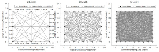 Figure 7 shows a WSN scenario in which the proposed adaptive wireless networking scheme can be performed; a similar scenario is widely adopted by the RTI-based and LOSL-based passive tracking schemes. There are 32 wireless nodes in total monitoring a 16-by-16 m2 area. For energy conservation, not all of the nodes are communicating with other nodes; instead, we just choose parts of them to form a LOSL web. For example, in Figure 7a, only 8 of the 32 nodes are chosen as active nodes, while the others stay in sleeping mode; we define this situation as Level 3, since there are 3 active nodes on one side of the rectangular area; in the same way, Figure 7b,c corresponds to Level 5 and Level 9, respectively.
