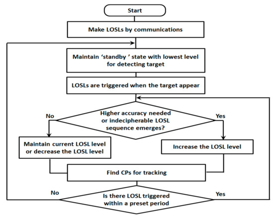 In the proposed scheme, the WSN is initialized by remaining in the lowest Level 3, as the “standby state” with a minimum number of LOSLs, where it waits for the target. When the target gets into the monitored area, the level of LOSL density will be dynamically adjusted depending on the situations for the purpose of energy conservation while guaranteeing the tracking performance.