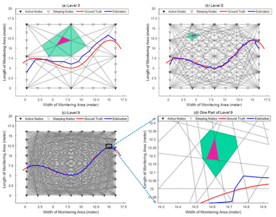 As we discussed in the multiple target scenario, the targets can be tracked using the single target tracking method and the subsequent LOSL triggering measurements when they are moving in separated regions. However, when the targets meet at the neighbor regions, the estimation work for multiple trajectories can have manifold forms of solution, which results in tracking failure. Increasing the web level can mitigate this problem. Figure 9 clearly shows the area size of the conflict regions (the surrounding aqua zone) of one specific region (the central magenta zone). It is apparent that the conflict region is shrunken as the LOSLs density increases (more than 10 m2 at Level 3, around several square meters at Level 5, and less than 1 m2 at Level 9, see in Figure 9d), which means that the more nodes are activated, the lower the probability becomes of the targets meeting at the conflict zone, and the lower the probability of tracking failure there will be; meanwhile, the maximal number of targets that can be simultaneously tracked will be extended.