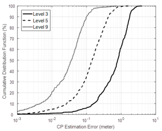 Results of the proposed scheme based on the geometric constraint method are shown in Figure 9: The actual trajectory of the target is made randomly. After identifying the CPs on the LOSLs, their connection indicates the estimated trajectory in blue line. It can be seen from Figure 9a–c that the more active nodes are adopted, the higher LOSL density being distributed, and, as a result, the more closely the estimated trajectory approximates to the ground truth. Then, we performed 100 Monte Carlo runs under Levels 3, 5 and 9; the error cumulative distribution function (CDF) is given in Figure 10. Under Level 3 with low hardware cost, more than 60 percent of the error is below 1 meter; what should be noted is that 90 percent of the simulation tracking error is below 0.1 m at the highest level (Level 9), which is a really efficient performance considering that the nodes are placed at intervals of 2 m.