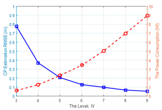 After 100 independent Monte Carlo runs, Figure 11 presents the root-mean-square error (RMSE) of the CP estimation from the Level 3 to 9, as well as the power consumption. Unsurprisingly, the tracking performance is improved by increasing the number of active nodes. What should be noted is that when the level is higher than 5, the CP estimation RMSE can be suppressed below 0.2 m. However, the enhancement in terms of active node number tends to be stolid at higher levels, while the power consumption (shown as the red dashed line) is steadily rising when more nodes are activated for communication to form the LOSLs. This suggests that the adaptive network undergoing tracking work can be set at Level 5 by default, and then the LOSL density can be dramatically adjusted for the consideration of energy conservation and tracking performance.