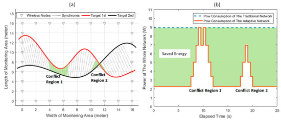 To show the energy efficiency of the adaptive networking scheme, simulations are conducted as follows. Assuming that two device-free targets are passing through the monitoring area simultaneously from left to right, an adaptive networking scenario is illustrated in Figure 12a. The synchrones represented by the dotted lines represent the relative positions of the two targets with respect of time. In the network, we assume that the required accuracy can be realized by Level 5, and Level 9 should be maintained to prevent the meeting event when the targets are getting close.