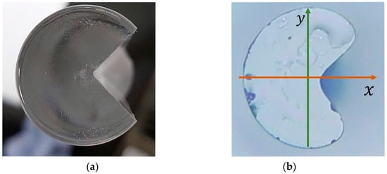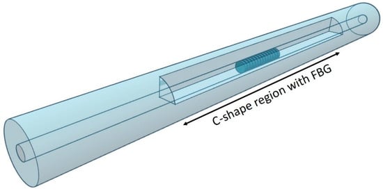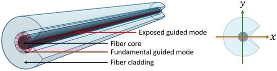 The most common example of this class of fibers is the D-shaped fiber, often used in interferometric sensors [] because of its fiber structure, partially exposing guided light to the environment. These fibers are usually polished or etched into a D-shape towards the core in order to expose the guided modes partially. The further the fiber cladding is removed towards the core, the more sensitive the fiber is to the ambient environment. A C-fiber, as depicted in Figure 1, operates on similar principles as the D-shaped optical fiber. However, the drawn-to-shape C-fiber results in guided light mode exposure without modifications, and the degree of exposure is much larger for one polarization than for the orthogonal polarization.