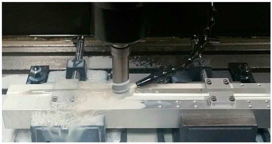 The C-fiber was fabricated in-house using a quarter cutout Germanium-doped single-mode fiber preform (G.652D) of 19.95 mm outer diameter, as shown in Figure 4a, where the preform core was exposed at the apex of the triangle. The cutout of the preform was an isosceles triangle with apex at 45° and equal sides of 9.35 mm. The preform was placed onto a customized jig which held it firmly in place, and the quarter was milled away from the workpiece with a high-precision knee mill (Sonic-Mill Rotary Series 10 Ultrasonic Machine). The milling bit used was of 25 mm diameter, operating at a spin speed of 2000 rpm and moving in repeated passes across the preform horizontally in a controlled manner at a speed of 30 mm/min. Each pass of the milling bit cut 1 mm of the preform, and, hence, multiple cuts were made to precisely remove the predetermined amount of material from the preform with accuracy of ±100 μm tolerance. During the milling process, coolant was applied by a jet spray between the milling bit and the workpiece (See Figure 3).