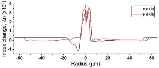 Because of fluid dynamics during the fiber drawing process, the exposed point became coated with a thin layer of mixed cladding/core material, resulting in extremely thin higher RI cladding where the fiber core was exposed. This thin layer of coating allowed the fiber to retain proper light-guiding characteristics, while also allowing guided modes to interact with the environment. Figure 5 shows the linear index profiles (measurement equipment: IFA-100) of both the x and y axes. The first index drop indicates the transition from the index oil to the cladding of the optical fiber. Index oil was required in the measurement equipment both as a medium that guides light towards the fiber, and to suspend the fiber in place for measurement. For the x axis, it is obvious that cladding was thinned to an effective thickness of less than 5 μm, resulting in guided modes extending out of the fiber into the ambient environment.