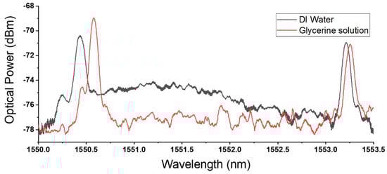 The spectral responses for deionized water and a glycerin solution with RI of 1.410, using the proposed sensor, are shown in Figure 8. It is obvious from the spectral plot that, while the FBG reflection spectrum for both orthogonal polarizations redshifted with the increase in ambient RI, x and y polarizations shifted with different magnitude because of differing extents of exposure to the ambient environment, forming the basis of RI measurement of this sensor.