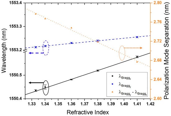 When submerged in DI water, the Bragg wavelengths of the x and y polarizations were 1550.435 nm and 1553.212 nm, respectively, with a difference between them of 2.777 nm. Because of the relationship between Bragg wavelength and effective RI of waveguide described in Equation (2), it was calculated that, with ambient RI of 1.333, was 1.445, and was 1.448. This was higher than the expected birefringence of an optical fiber with pure silica cladding and could be attributed to the induced stress in the drawn fiber due to the irregular shape of the preform.