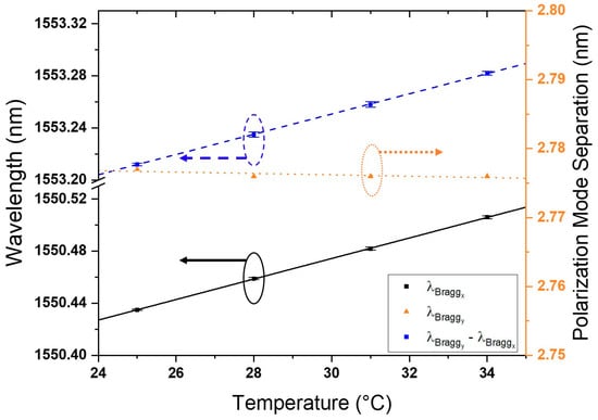 The sensor assembly was placed in a water bath with temperatures varied from 25 to 34 °C, as determined in Section 3. As the sensor was bonded to the nylon holder, the temperature response was a contribution of the material properties of fiber, holder, and adhesive used. As temperature increased, the Bragg wavelengths of both polarizations redshifted. By considering the evolution of the spectral difference between the Bragg wavelengths of the orthogonal modes (Figure 10), it was apparent that a small ambient temperature fluctuation within 9 did not significantly influence RI measurement capability.