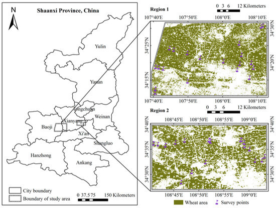 The study area encompassed two typical regions affected by the disease (region 1 and region 2), located in the western Guanzhong plains, Shaanxi Province, China (Figure 1). The area was located in a high-yield farming area with good hydro-thermal conditions, along with a mild and humid climate. In this region, there are four seasons, precipitation is concentrated, and rainfall and temperature are synchronized. The average annual temperature ranges from 9.9 to 15.8 °C. The average annual rainfall ranges from 500 to 700 mm, and rainfall decreases from west to east, and from south to north. The average annual evaporation ranges from 1000 to 1200 mm, and the frost-free period spans from 130 to 220 days [33]. Winter wheat is a major local crop, and the area provides a suitable propagating and developing environment for the powdery mildew pathogen.