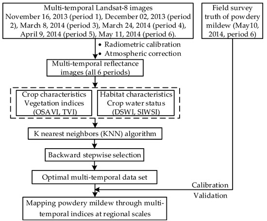In this study, we used early multi-temporal satellite imagery to develop a model that focuses on monitoring the occurrence of powdery mildew in the late winter wheat growth period (filling period) at regional scales. Multi-temporal Landsat-8 imagery was adopted in this study. The objectives of this study were (1) to identify the optimal multi-temporal data set for the monitoring of powdery mildew occurrence in winter wheat from a number of different multi-temporal combinations; (2) to assess the feasibility of using imagery containing information for early critical disease infection periods to monitor the occurrence of powdery mildew in late winter wheat growth period; (3) to evaluate the performance of the multi-temporal indices-based KNN disease monitoring approach and its capability for mapping powdery mildew occurrence.