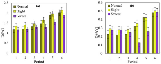 The DSWI and SIWSI provided the lowest values for severely diseased samples in six periods. The OSAVI and TVI provided the lowest values for normal samples in the first three periods, and which provide the lowest values for severely diseased samples during the remaining three periods. Additionally, the indices among the three samples exhibited different changing patterns over time.