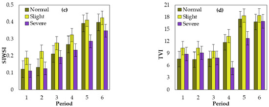 Mean and standard deviations of the (a) DSWI, (b) OSAVI, (c) SIWSI, and (d) TVI for both normal and infected (slight and severe) plots at different periods.