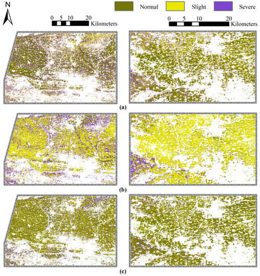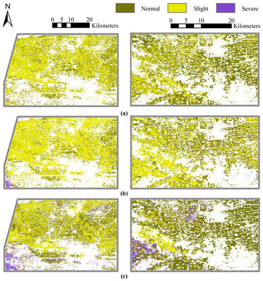 Maps of powdery mildew occurrence severity in winter wheat produced by the (a) CART, (b) BPNN, and (c) KNN models using optimal multi-temporal VIs.