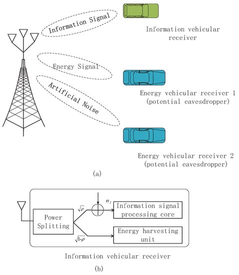 (a) V2X-SWIPT system model for two energy vehicular receivers and one information vehicular receiver; (b) the block diagram of the information vehicular receiver model for wireless information and power transfer.