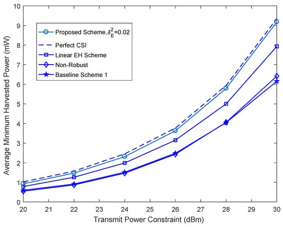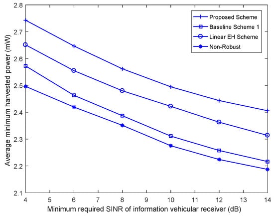In this section, we provide simulation results to validate the performance of our proposed robust beamforming design algorithm. The considered vehicular secure downlink channel in Section 2 for Rayleigh flat-fading environments with zero-mean and unit variance is considered. Unless specified otherwise, it is assumed that there are energy vehicular receivers. Indeed, we have some other configurations that can be employed with a different number of energy vehicular receivers, transmit antennas and receiver antennas; however, the simulation results will be similar, the only difference is the computation complexity. In our simulations, we set , , r = 10 dB, = 0 dB, 25 dBm, mW, dBm. For the nonlinear EH model, we set: mW, , . To the imperfect CSI between the base station and energy vehicular receivers, is defined as the channel uncertainty ratio to demonstrate the kth energy vehicular receiver’s channel estimate error. Without loss of generality, it is assumed that . We solve the optimization problem (21) and compute the average minimum harvested energy power per energy vehicular receiver by averaging over 1000 channel realizations.