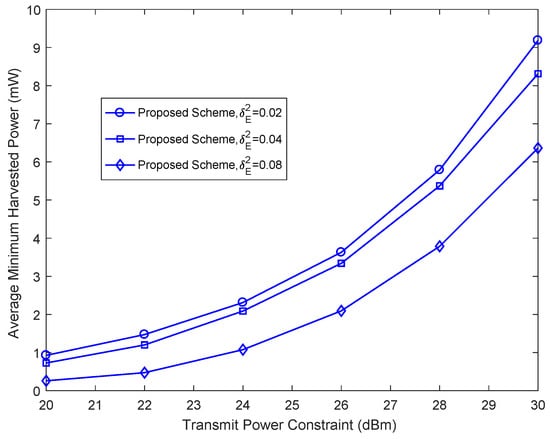 In Figure 3, we study the average minimum harvested energy power per energy vehicular receiver versus the maximum power of the base station, P, for energy vehicular receivers, and different than the maximum channel estimation errors, . As can be seen, with the increase of P, the average minimum harvested energy power per energy vehicular receiver increases for increasing maximum channel estimation error, . Indeed, with increasing the imperfectness of channel estimation, the base station has to allocate less power to the artificial noise and energy signals to ensure vehicular secure communication.