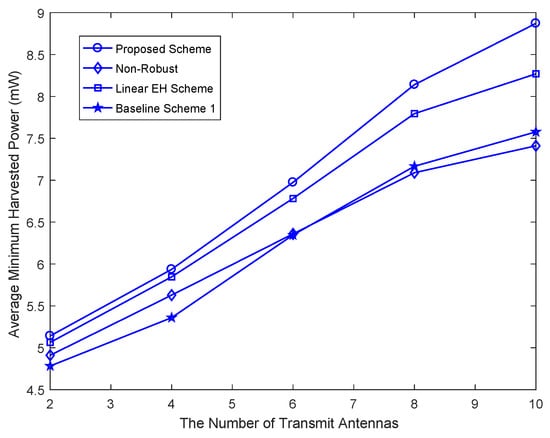 Figure 5 shows the average minimum harvested energy power per energy vehicular receiver versus the number of the transmit antenna, , for energy vehicular receivers, , and different beamforming design schemes. It can observed that the average minimum harvested energy power per energy vehicular receiver in the considered system increases with the increasing number of antennae. These results advise that a higher amount of energy is available in the RF for energy collecting when the number of the transmit antennae increases. This is owing to the fact that with more transmit antennae the direction of energy beamforming matrix can be more accurately steered towards the energy vehicular receivers, which further increase the amount of energy available in the RF for energy collecting. Among all the considered beamforming design schemes, the proposed beamforming design scheme also achieves a better performance than the other beamforming design schemes.