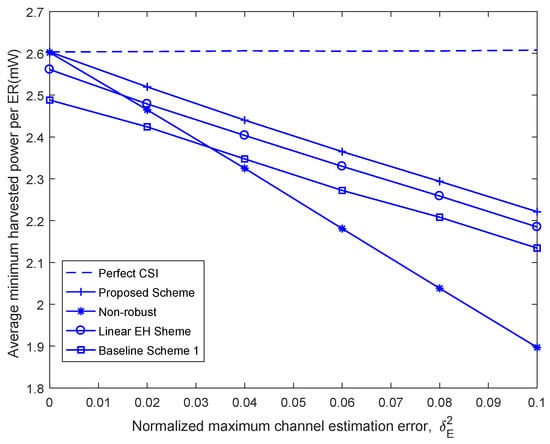 Figure 6 illustrates the average minimum harvested energy power per energy vehicular receiver versus the maximum channel estimation error, i.e., , for different beamforming design schemes. As seen in Figure 6, it can be seen that the minimum harvested energy per energy vehicular receiver of the proposed robust beamforming design scheme decreases with the increase of the estimated channel error, , which confirms the motivation of the worse case robust optimization. Moreover, we learn intuitively that the proposed nonlinear EH beamforming design scheme performs considerably better than other beamforming design schemes but worse than the perfect case.