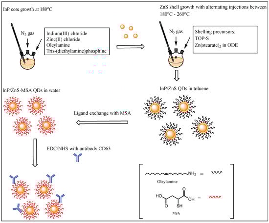 Synthetic scheme for the InP/ZnS quantum dots (QDs) conjugated to the antibody anti-CD63.