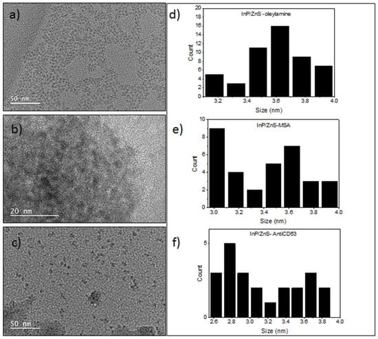The TEM images in Figure 2 show the InP/ZnS QDs with the oleylamine ligand and after ligand exchange both exhibiting an average size of around 3.6 nm. The water-soluble QDs showed little aggregation in the images, but stayed in solution for weeks after their synthesis. There is a visible reduction in size with the InP/ZnS–Anti-CD63 conjugates, which was observed from the TEM images from an average size of 3.6 nm to between 2.6–3.8 nm for the InP/ZnS–AntiCD63 conjugates. The size difference could be due to the ligand exchange. InP/ZnS QDs that have carbon-based oleylamine ligands and MSA ligands on them are harder to image on TEM due to their lower contrast on carbon-based grids. Limited aggregation was seen from the InP/ZnS–Anti-CD63 conjugates as well.