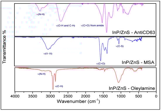 Fourier transform infrared spectroscopy (FTIR) spectra of the InP/ZnS–oleylamine, InP/ZnS–MSA, and InP/ZnS–Anti-CD63.