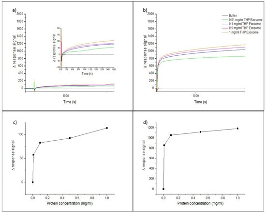 Surface plasmon measurements of the THP-1 derived exosomes using just the antibody (a) and the InP/ZnS–Anti-CD63 (b). Binding curves of the response of the sensor chip to the binding of the exosomes using the Anti-CD63 (c) and InP/ZnS–Anti-CD63 (d). For the InP/ZnS–Anti-CD63, the binding shows a steep increase for the lowest protein concentration of 0.01 mg/mL. The higher protein concentrations then increase gradually.
