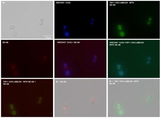 Fluorescence microscopy (Figure 6) also shows the successful labeling of cells and exosomes with InP/ZnS–Anti-CD63, which corresponded to laser excitation at 490 nm and a 525-nm emission filter. A InP/ZnS–Anti-CD63 concentration of 1 mg/mL was used for THP-1 derived exosomes labeling, but with the protein ratio of 1 (exosomes):3 (InP/ZnS–Anti-CD63).