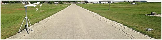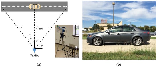 Radar is a possible alternative to optical cameras for vehicle sensing in traffic monitoring, perimeter security, and autonomous driving applications [25,26,27,28,29,30,31,32,33]. SAR imaging of stationary ground vehicles from airborne sensors has already been a subject of extensive investigations in the past [25,26,27,28]. ISAR imaging of moving vehicles from a stationary ground radar has also been realized in the small-angle scenario previously [31,32]. Wide-angle imaging may offer better resolution and richer geometrical features. In Reference [33], 360° ISAR imaging was carried out to obtain a high-resolution image map of a vehicle. However, the measurement was done on a turntable. In Reference [34], we reported on the cooperative wide-angle UWB imaging of vehicles, where the imaged vehicles are instrumented to provide range information. In this paper, we address the non-cooperative scenario, where the vehicle range is not known and will need to be estimated from the measured range profile data. To collect the data, the PulsON 410 (P410) UWB transceiver is used as a mono-static radar [13]. The sampling rate for consecutive range profiles is chosen such that: (i) It is greater than the Doppler extent of the target to ensure no Doppler aliasing occurs, and (ii) it is as low as possible to maximize the number of coherent pulse integration to reduce noise. In this case, it is set to 67 Hz. A single dual-ridged broadband horn (Dorado International, GH1-12N, 1–12 GHz) is employed for both transmit and receive, through the use of a circulator (CS-16-50 from MLCI Corporation). Vertical polarization is used on transmit and receive. Note that the 10 MHz pulse repetition frequency is fixed in the firmware of the radar and is not adjustable by the user. Table 1 summarizes the measurement parameters.