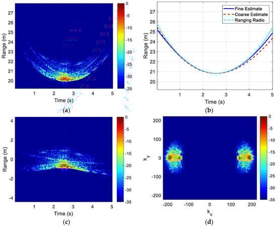 Here, corresponds to the estimated range to the target center in each instance in dwell time. The measurement angle () can found from and through the geometry in Figure 1a. The data are then polar-reformatted onto a uniform grid using a bilinear interpolation scheme. A 2-D inverse fast Fourier transform (IFFT) is then applied over the entire k-space to generate the wide-angle ISAR image.