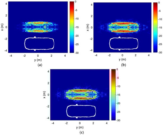 The resulting image, after coarse motion compensation, is shown in Figure 3a. The 2-D ISAR image in this figure (as well as all subsequent images) represents the relative RCS level in decibel. In addition, a white geometrical outline of the top-view of the vehicle is provided below the image for reference. An outline of the vehicle can be discerned in the ISAR image. The image after fine motion compensation is shown in Figure 3b. The solid blue curve in Figure 2b shows the corresponding range track after the p-norm minimization. The image in Figure 3b is now well focused. Note the red spot on the roof of the vehicle at = 1 and slightly below = 0. This is due to two front-facing, side-by-side corner reflectors that are intentionally placed on the roof of the vehicle. The focusing of the composite corner reflector in the final image further validates the result. Since we have mirrored the data in k-space, the spot also appears on the side of the vehicle. The estimated down-range resolution of the image is 10 cm, and the estimated cross-range resolution of the image is 5 cm. Finally, as a reference for comparison, the image generated using the ranging radio data (without the p-norm minimization) is shown in Figure 3c. The ISAR image in Figure 3b after the blind motion compensation is on-par, if not better focused, than that of using the cooperative ranging radio data in Figure 3c. Based on the image in Figure 3b, the length and width of the vehicle are estimated to be 4.68 m by 1.82 m. They are close to the actual dimensions of the vehicle, which is 4.80 m by 1.83 m.