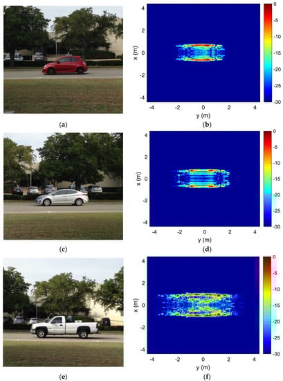 While we have shown that it is possible to generate a focused ISAR image for moving vehicles on the road under the wide-angle scenario, two comments are in order. First, it is noted that target features in the front and rear of the vehicles are lacking. Observing the vehicles over a wider angular swath could reveal more of these features. In the collected data set, we are able to cover up to a 70° angular swath. This is limited largely by the beamwidth of the horn antenna. Consequently, there will be a tradeoff between gathering more frontal features and SNR. Second, it is noted that the sides of the vehicle are slightly more curved than their geometrical shapes in all the acquired images. The effect is most prominent in the large truck in Figure 4f. This distortion is likely due to the near-field effect from the large flat side surface of the vehicles. Such image distortion may be compensated by using a near-field backprojection algorithm [36] or a near-field to far-field transform [37,38]. This topic is beyond the scope of the present study. Third, the collected data contain only one vehicle during the collection interval. If multiple vehicles are present in the scene, the target returns will need to be separated in the range and/or Doppler space before the image formation process.
