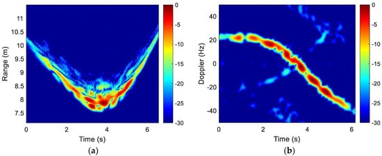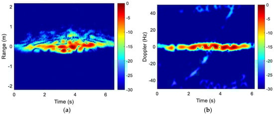 After using Equation (4) to align the collected data based on the fitted curve shown in Figure 8a, we obtain the aligned range and Doppler profiles shown in Figure 10. The translational motion has been largely removed.