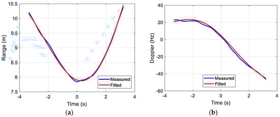 The RCS centroids in range and Doppler are first extracted from the range profiles and Doppler profiles. The cost function in Equation (9) is then minimized to generate the fitted curves. Figure 8a shows a comparison of the fitted curve to the extracted curve for range. Figure 8b shows a comparison of the fitted curve to the extracted curve for Doppler. To generate these fitted curves, the order of the model is set to N = M = 3 and is set to 0.001 in Equation (9).