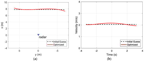 In the cost function, controls the relative weight between Doppler and range errors. The MATLAB routine fminunc is used in the optimization. In addition, it is found that a regularization term, which is proportional to the variance of the velocity from the approximate measured velocity of the drone, should be added to the total cost to arrive at a stable solution. Once the motion parameters are found, we carry out the motion compensation using Equation (4).