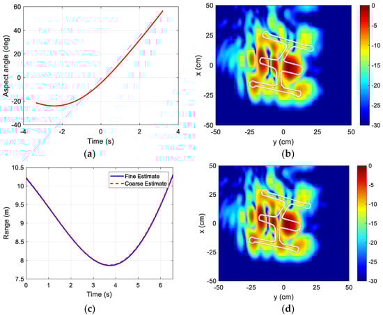 Drone ISAR image formation. (a) Drone aspect angle vs. time; (b) Coarse motion compensation image; (c) Coarse vs. fine estimate; (d) Fine motion compensation image.
